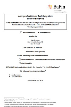 Für die Anzeige eines Bewerters ist das „Anzeigeschreiben zur Bestellung eines externen Bewerters“ zu verwenden. ✓